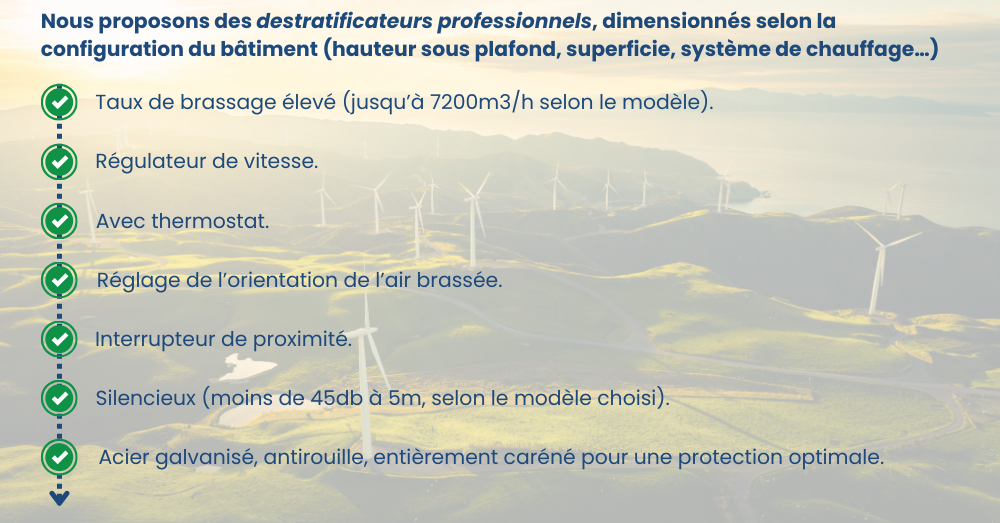 Tous les bâtiments tels que les usines, entrepôts, supermarchés, gymnases, gares, ou encore les lieux de culte peuvent opter pour des déstratificateurs.